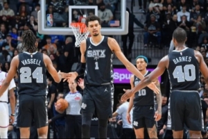 要聊这支马刺,你永远绕不开文班亚马,就像聊三分球绕不开库里一样。经过两年进化和少林特训,22岁的文班已显现出超巨之姿,场均26分12篮板4助攻3.6盖帽,真实命中率61%。开赛前五场更是轰出了30分15篮板5盖帽的场均数据,带领马刺豪取五连胜,把仗着内线深度试图单防文班的独行侠打出33分分差,让所有球队都不敢单防。