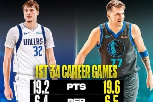 美媒对比了弗拉格和东契奇在菜鸟赛季球队前35场比赛的数据对比,巧合的是两人都在35场比赛里出战34场,数据如下:
