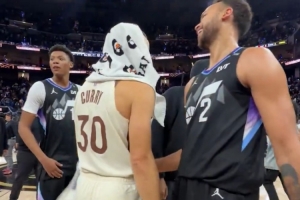 GIF-李凯尔赛后与库里追梦小佩顿拥抱互动